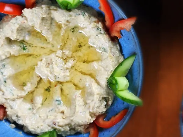 Finely chopped and grilled aubergine mixed with tahini sauce and lemon juice.